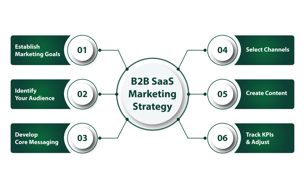 The image visually represents these six interconnected stages, forming a continuous loop around your B2B SaaS Marketing Strategy, where each node represents a critical automation point from planning to performance refinement.